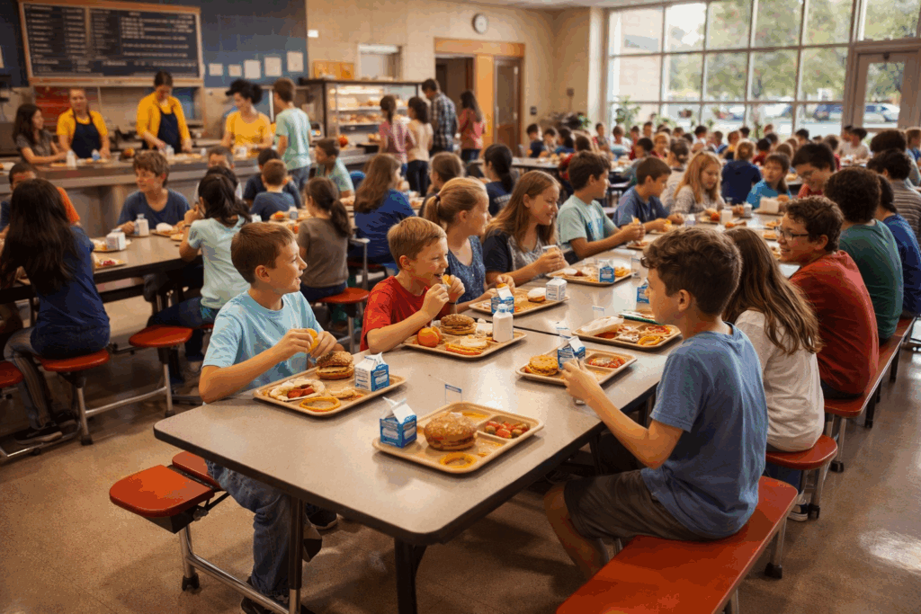 Tussen de middag eten ze lunch in een grote cafeteria. Dat kan warm eten zijn of eten van thuis.